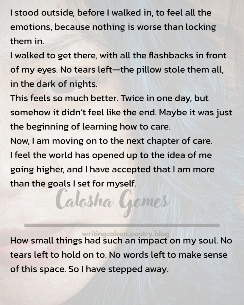 I walked to get there, with all the flashbacks in front of my eyes. No tears left—the pillow stole them all, in the dark of nights.